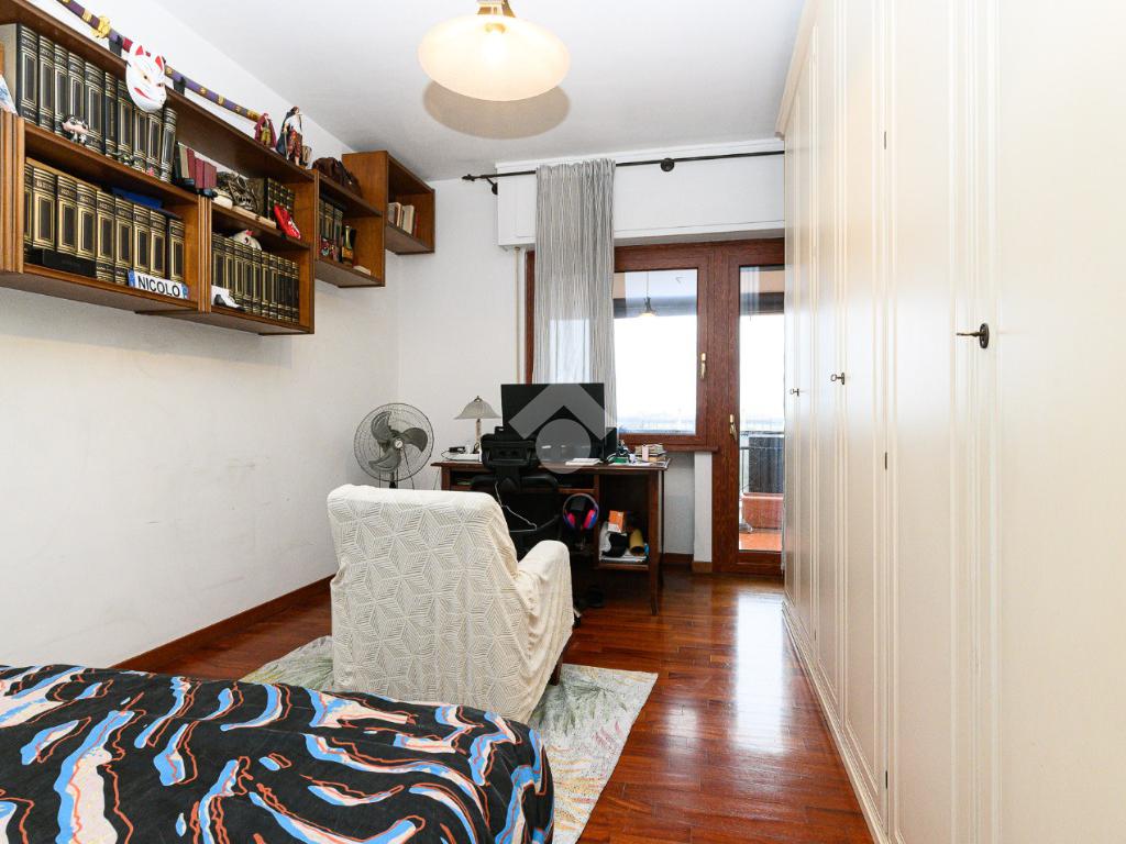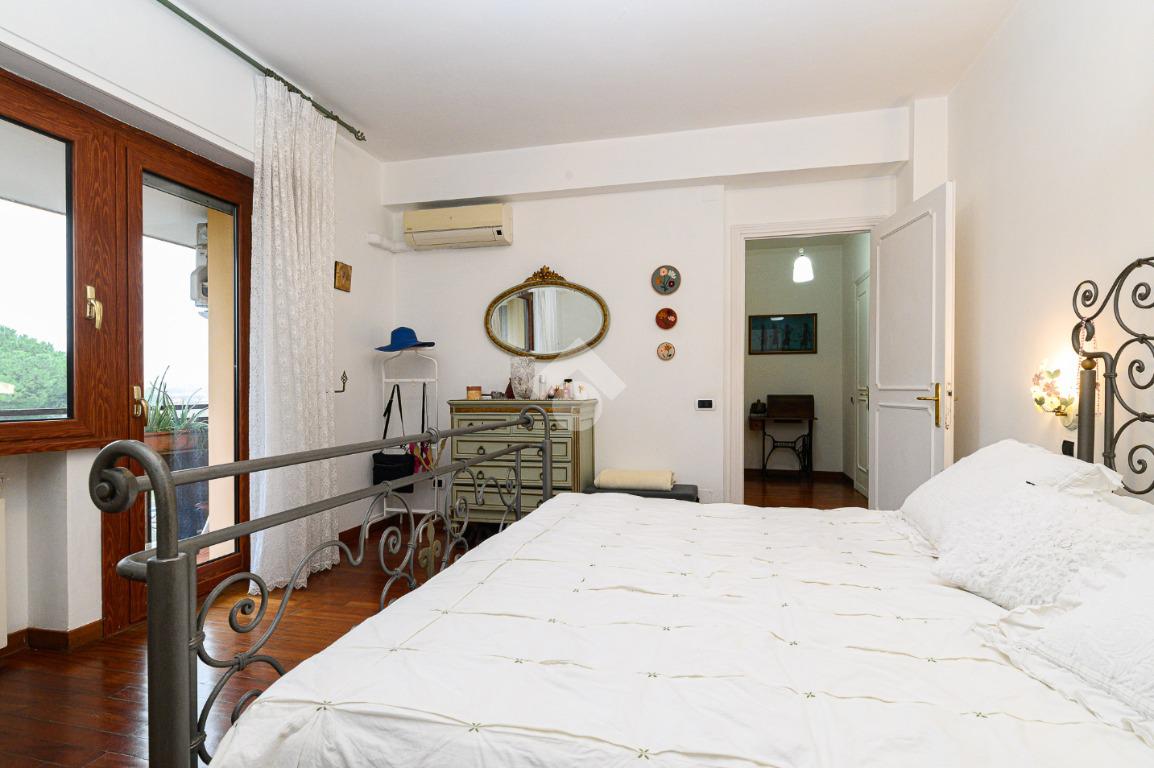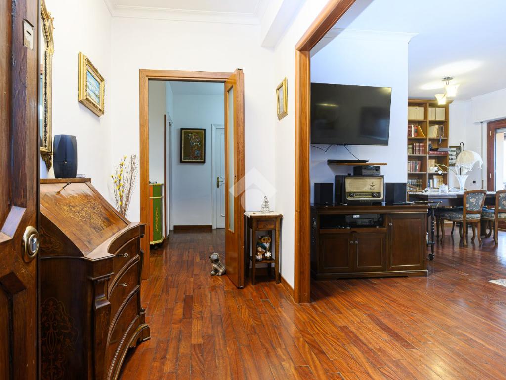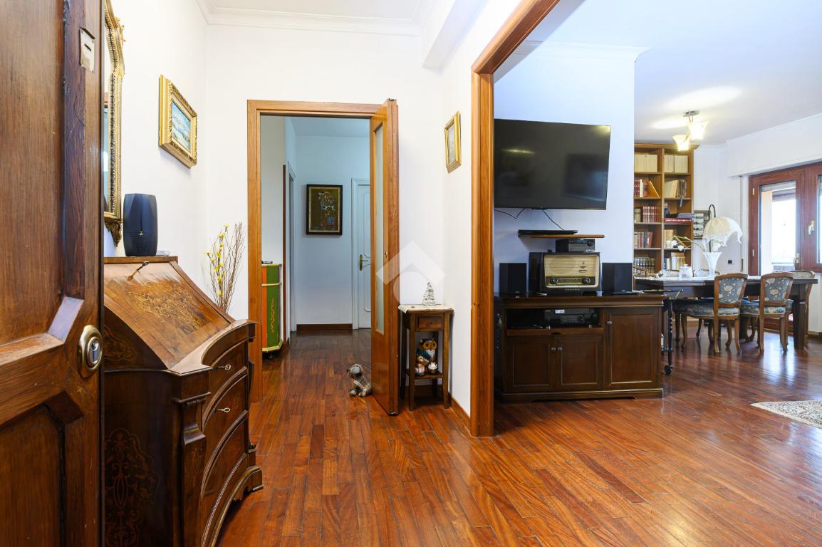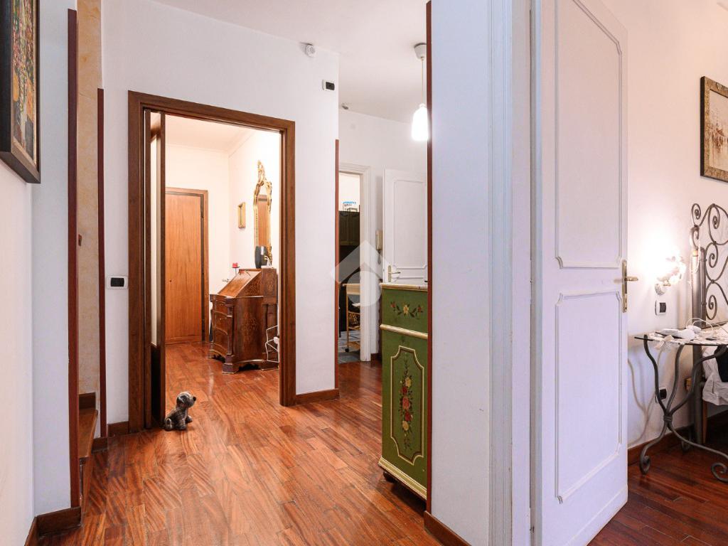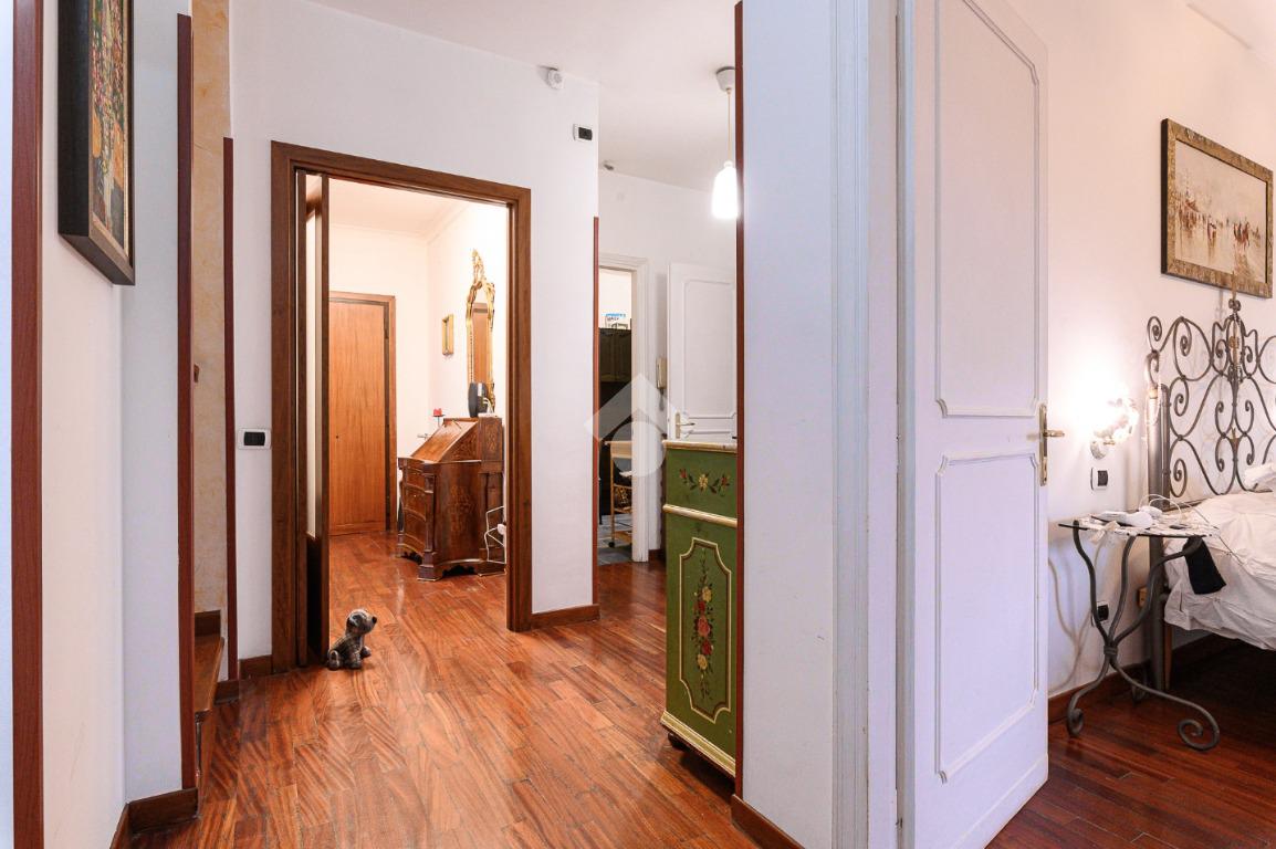 Un disimpegno conduce alle due camere da letto una con balcone , alla cucina abitabile anch'essa con uscita su altro balcone, locale lavanderia, cameretta di servizio e al bagno.